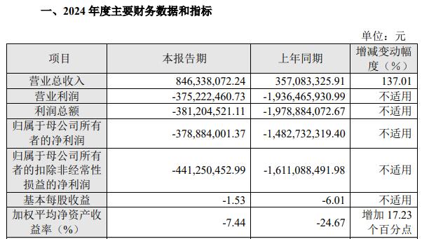 2023年年报显示,公司实现营业收入3.57亿元,同比下降65.49%;归母净利润-14.83亿元,上年同期为-9.09亿元;扣非净利润-16.11亿元,上年同期为-10.20亿元;经营活动产生的现金流量净额为-9.08亿元,上年同期为-18.52亿元。