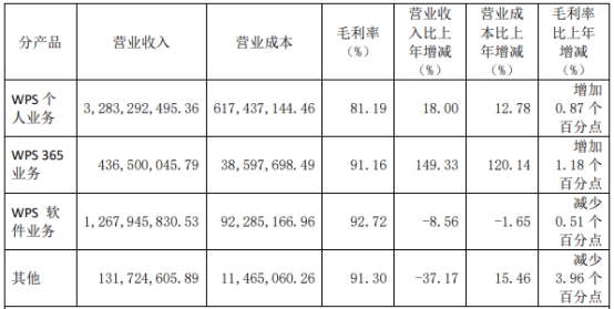 主营业务中,WPS个人业务收入328,329万元,同比增长18.00%;WPS 365业务收入43,650万元,同比增长149.33%;WPS软件业务收入126,795万元,同比下降8.56%;其他业务收入13,172万元,同比下降37.17%。