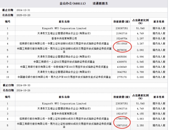 截至2024年年末,中国工商银行股份有限公司-易方达上证科创板50成份交易型开放式指数证券投资基金持股金山办公的数量为9,678,036股,持股比例为2.09%;去年三季末其持股金山办公的数量为10,871,010股,持股比例为2.35%。