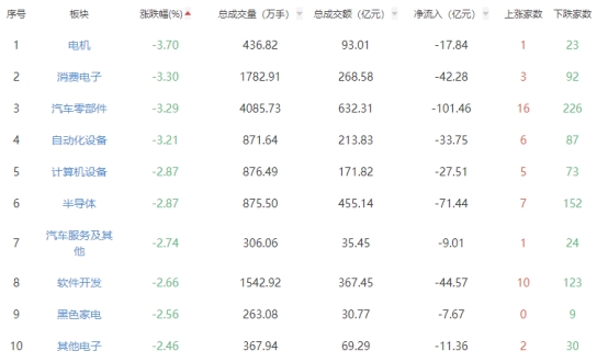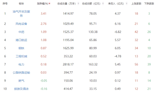 板块方面,油气开采及服务、风电设备、中药等板块涨幅居前,电机、消费电子、汽车零部件等板块跌幅居前。