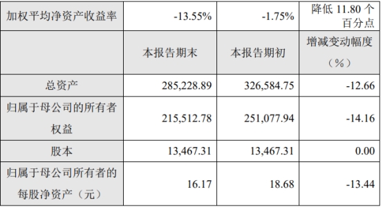报告期末,公司总资产285,228.89万元,较期初减少12.66%;报告期末,归属于母公司的所有者权益为215,512.78万元,较期初减少14.16%。