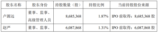 截至公告披露之日,公司监事卢源远、董事赵严分别直接持有公司8,685,368股、6,087,868股股份,占公司总股本的比例分别为1.87%、1.31%。
