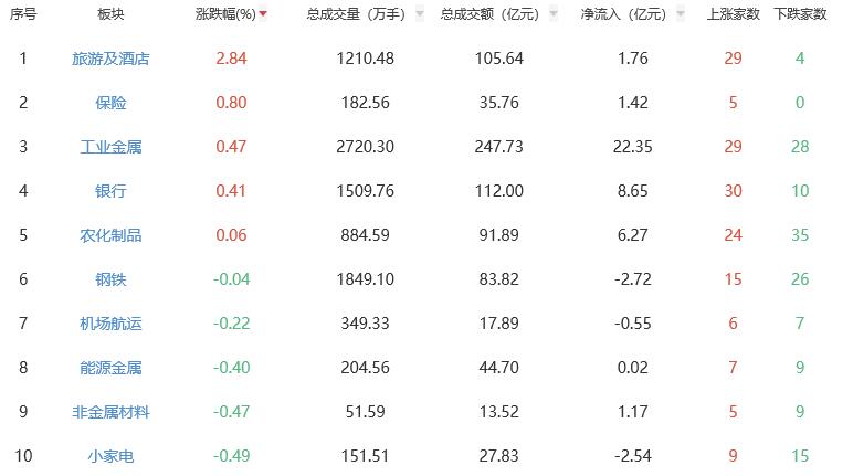 板块方面,旅游及酒店、保险、工业金属、银行等涨幅居前,IT服务、军工电子、军工装备、计算机设备等跌幅居前。