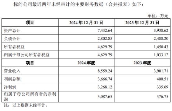 2023年、2024年,标的公司营业收入分别为3,901.71万元、8,559.24万元,净利润分别为335.69万元、3,268.12万元,归属于母公司所有者的净利润分别为376.75万元、3,087.65万元。