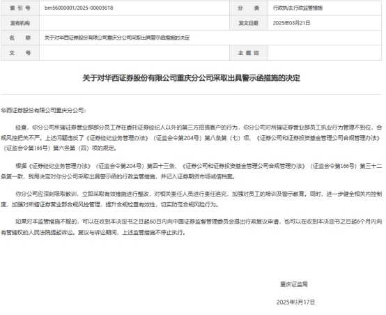 根据《证券经纪业务管理办法》(证监会令第204号)第四十三条、《证券公司和证券投资基金管理公司合规管理办法》(证监会令第166号)第三十二条第一款, 重庆证监局决定对华西证券重庆分公司采取出具警示函的行政监管措施,并记入证券期货市场诚信档案。