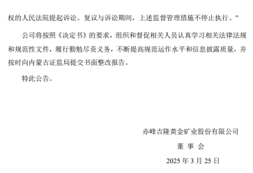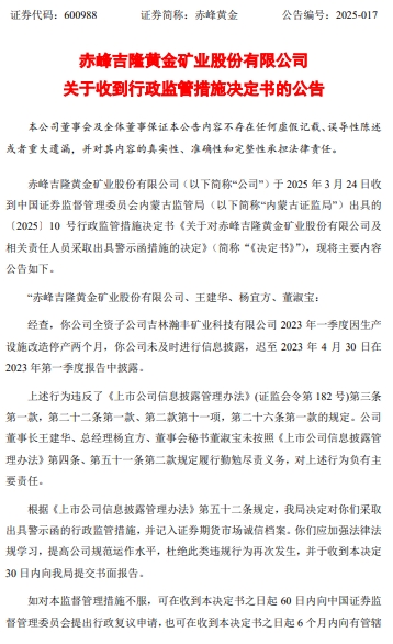 中国经济网北京3月25日讯 赤峰黄金(600988.SH)昨晚披露的关于收到行政监管措施决定书的公告显示,公司于2025年3月24日收到中国证券监督管理委员会内蒙古监管局(以下简称“内蒙古证监局”)出具的〔2025〕10号行政监管措施决定书《关于对赤峰吉隆黄金矿业股份有限公司及相关责任人员采取出具警示函措施的决定》(简称“《决定书》”)。