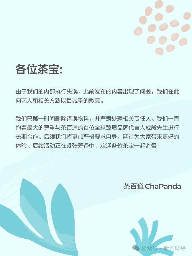 24日下午,茶百道在微博发布道歉声明,承认此事件是内部的执行失误,已第一时间删除错误物料,严肃处理相关责任人,并表示将与代言人进行长期合作。
