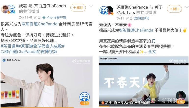 作为国内热门茶饮品牌,茶百道的出圈方式与其他品牌有所不同,近期在流量营销方面下足了功夫。2024年11月,茶百道官方微博宣布成毅为茶百道首位全球臻质品牌代言人。本月,茶百道又官宣黄子弘凡为乐活品牌大使。