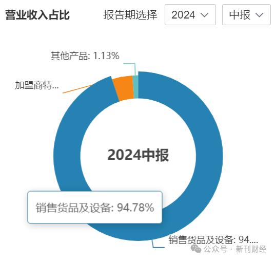 与蜜雪冰城相似的是,茶百道也做加盟商的供应链生意。靠给加盟店卖原料,茶百道在2024年成功把自己送上港股。根据2024年中报,茶百道给加盟店销售的货品及设备收入为22.71亿元,占比高达94.78%;加盟费收入近1亿元,占比4.2%。