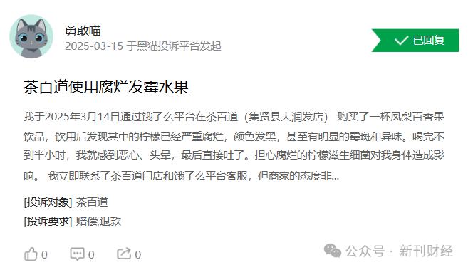 其二,庞大数量的加盟店对于企业的管理能力要求很高,对于茶饮店而言最重要的就是食品安全。对于315期间被爆出的蜜雪冰城隔夜柠檬片问题,消费者尚可容忍,但根据黑猫投诉平台消息,茶百道部分商家用已腐烂发霉水果滥竽充数,则是令人无语。