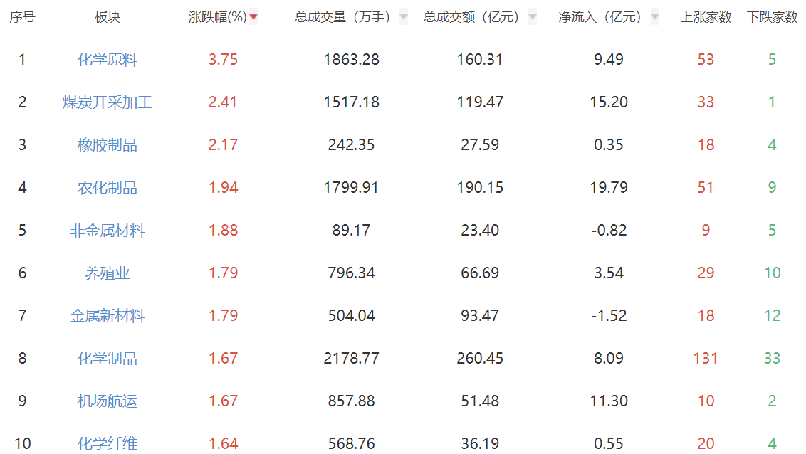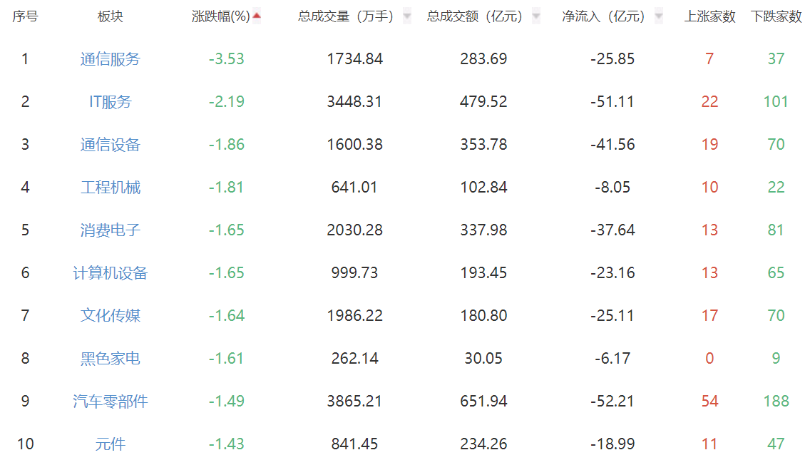 板块方面,化学原料、煤炭开采加工、橡胶制品等涨幅居前,通信服务、IT服务、通信设备等跌幅居前。