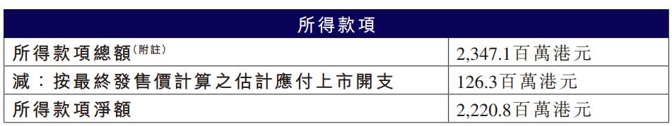 南山铝业国际的最终发售价为26.60港元,所得款项总额为2,347.1百万港元,扣除最终发售价计算之估计应付上市开支126.3百万港元,所得款项净额为2,220.8百万港元。