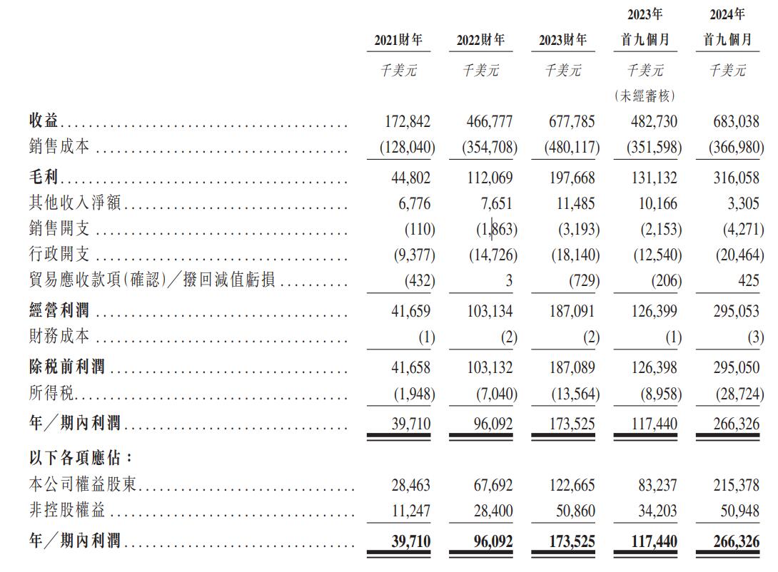 2021财年、2022财年、2023财年、2024年首九个月,南山铝业国际的收益分别为172,842千美元、466,777千美元、677,785千万美元、683,038千美元;期内利润分别为39,710千美元、96,092千美元、173,525千美元、266,326千美元。