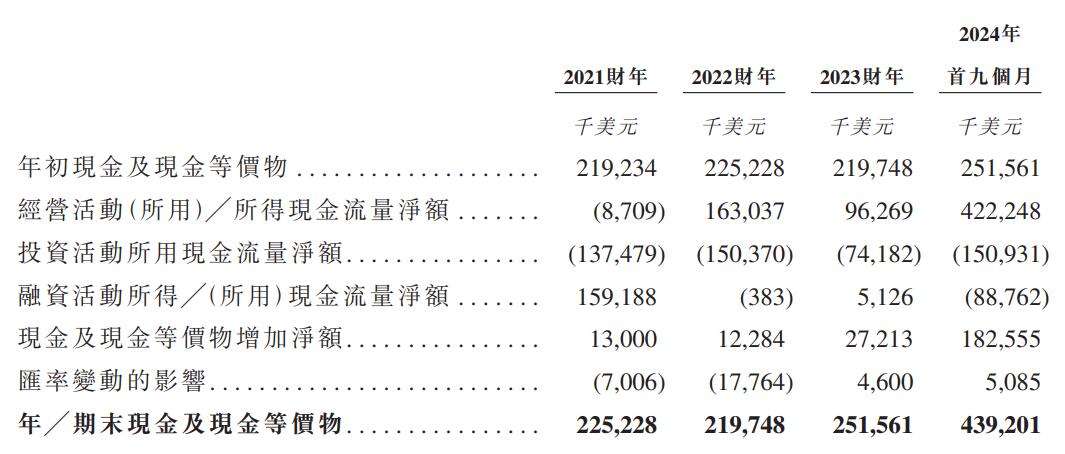 2021财年、2022财年、2023财年、2024年首九个月,南山铝业国际的经营活动所得现金流量净额分别为-8,709千美元、163,037千美元、96,269千美元、422,248千美元。