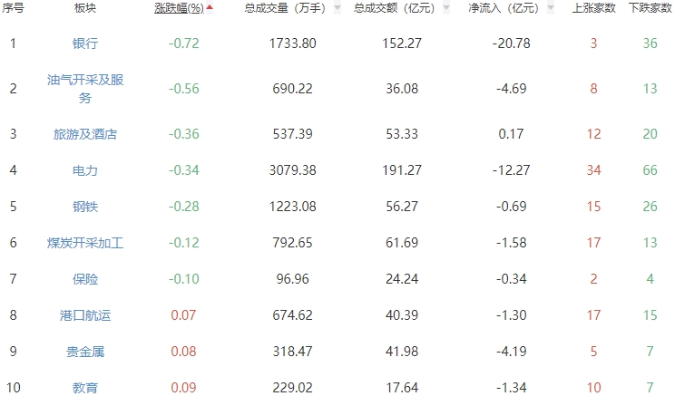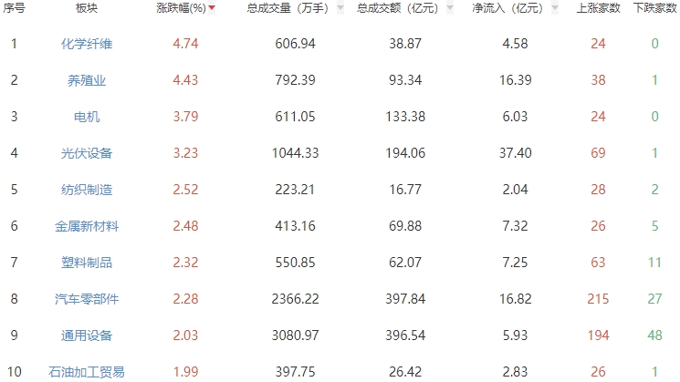 板块方面,化学纤维、养殖业、电机等板块涨幅居前,银行、油气开采及服务、旅游及酒店等板块跌幅居前。