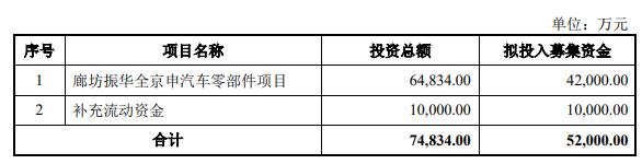 2024年11月28日,无锡振华发布的向不特定对象发行可转换公司债券证券募集说明书(申报稿)(修订版)显示,公司本次向不特定对象发行可转债拟募集资金总额不超过52,000万元(含本数),扣除发行费用后将用于以下项目:廊坊振华全京申汽车零部件项目、补充流动资金。