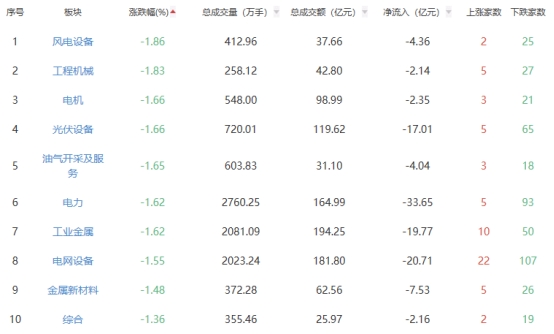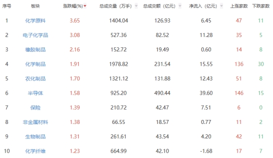 板块方面,化学原料、电子化学品、橡胶制品等板块涨幅居前,风电设备、工程机械、电机等板块跌幅居前。