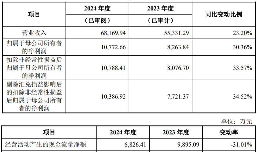 2024年度,浙江华远的营业收入为68,169.94万元,同比增长23.20%;归属于母公司所有者的净利润为10,772.66万元,同比增长30.66%;扣除非经常性损益后归属于母公司所有者的净利润为10,788.41万元,同比增长33.57%;经营活动产生的现金流量净额为6,826.41万元,同比下降31.01%。