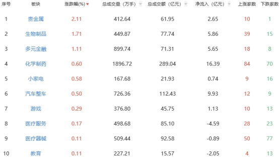 板块方面,贵金属、生物制品、多元金融等板块涨幅居前,农化制品、橡胶制品、化学原料等板块跌幅居前。