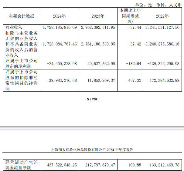 中国经济网北京3月28日讯 丽人丽妆(605136.SH)昨晚发布2024年年度报告。报告期内,丽人丽妆全年实现营业收入17.28亿元,同比下滑37.44%;归属于上市公司股东的净利润-2440.03万元,上年同期为2952.76万元;归属于上市公司股东的扣除非经常性损益的净利润-3998.33万元,上年同期为1185.33万元;经营活动产生的现金流量净额4.38亿元,同比增长100.88%。