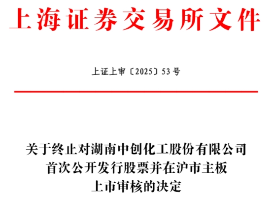 中国经济网北京3月30日讯 上交所网站3月28日发布关于终止对湖南中创化工股份有限公司(以下简称“中创化工”)首次公开发行股票并在沪市主板上市审核的决定。