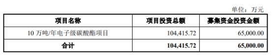中创化工原拟募集资金65,000.00万元,用于10万吨/年电子级碳酸酯项目。
