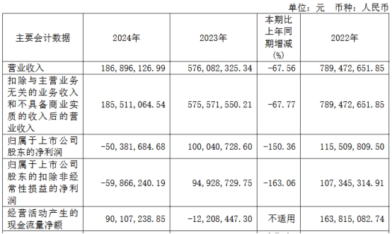 2024年,公司实现营业收入1.87亿元,同比下降67.56%;归属于上市公司股东的净利润为-5,038.17万元,上年同期为10,004.07万元;归属于上市公司股东的扣除非经常性损益的净利润为-5,986.62万元,上年同期为9,492.87万元;经营活动产生的现金流量净额为9,010.72万元,上年同期为-1,220.84万元。