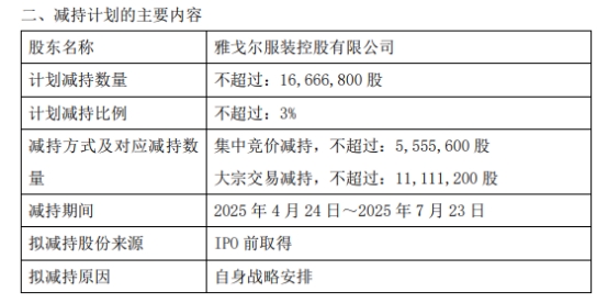 雅戈尔服装自减持计划公告之日起15个交易日后的3个月内拟通过集中竞价交易方式减持不超过公司总股本的1%,即减持数量不超过5,555,600股,且在任意连续90个自然日内,通过集中竞价交易方式减持不超过公司总股本的1%,即5,555,600股;自减持计划公告之日起15个交易日后的3个月内拟通过大宗交易方式减持不超过公司总股本的2%,即减持数量不超过11,111,200股,且在任意连续90个自然日内,通过大宗交易方式减持不超过公司总股本的2%,即11,111,200股。