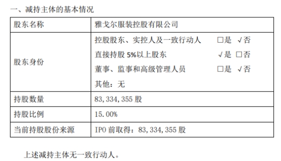 截至公告日,公司持股5%以上股东雅戈尔服装持有公司无限售条件流通股83,334,355股,占公司总股本15.00%,上述所持股份全部来源于公司首次公开发行前持有的股份,并于2022年10月28日起上市流通。