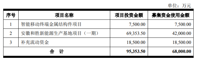 和胜股份昨日披露向特定对象发行A股股票募集说明书(修订稿)显示,本次发行预计募集资金总额不超过68,000.00万元(含本数),扣除发行费用后将用于智能移动终端金属结构件项目、安徽和胜新能源生产基地项目(一期)、补充流动资金。