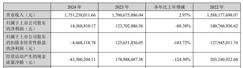 中国经济网北京4月3日讯 三态股份(301558.SZ)昨晚发布的2024年年度报告显示,公司2024年实现营业收入17.51亿元,同比增加2.97%;归属于上市公司股东的净利润1436.88万元,同比减少88.38%;归属于上市公司股东的扣除非经常性损益的净利润-466.81万元,上年同期为1.26亿元;经营活动产生的现金流量净额-4350.02万元,上年同期为1.79亿元。