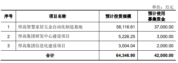 悍高集团拟在深交所主板上市,拟募资42,000.00万元,用于悍高智慧家居五金自动化制造基地、悍高集团研发中心建设项目和悍高集团信息化建设项目。