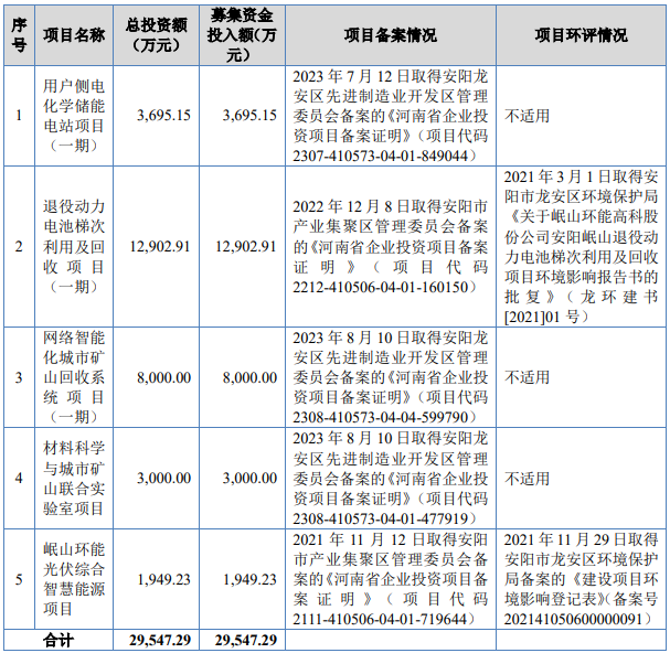 岷山环能拟在北交所上市,拟募资29,547.29万元,用于用户侧电化学储能电站项目(一期)、退役动力电池梯次利用及回收项目(一期)、网络智能化城市矿山回收系统项目(一期)、材料科学与城市矿山联合实验室项目和岷山环能光伏综合智慧能源项目。