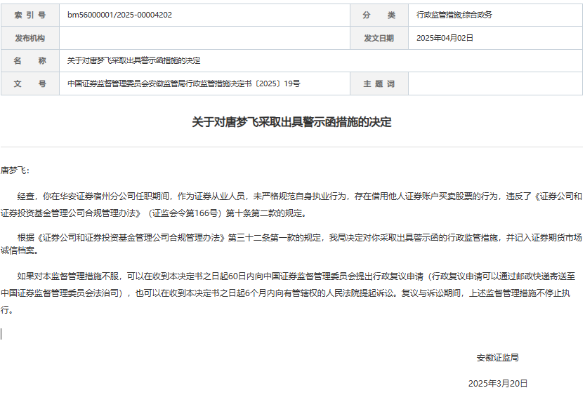 根据《证券公司和证券投资基金管理公司合规管理办法》第三十二条第一款的规定,安徽证监局决定对唐梦飞采取出具警示函的行政监管措施,并记入证券期货市场诚信档案。