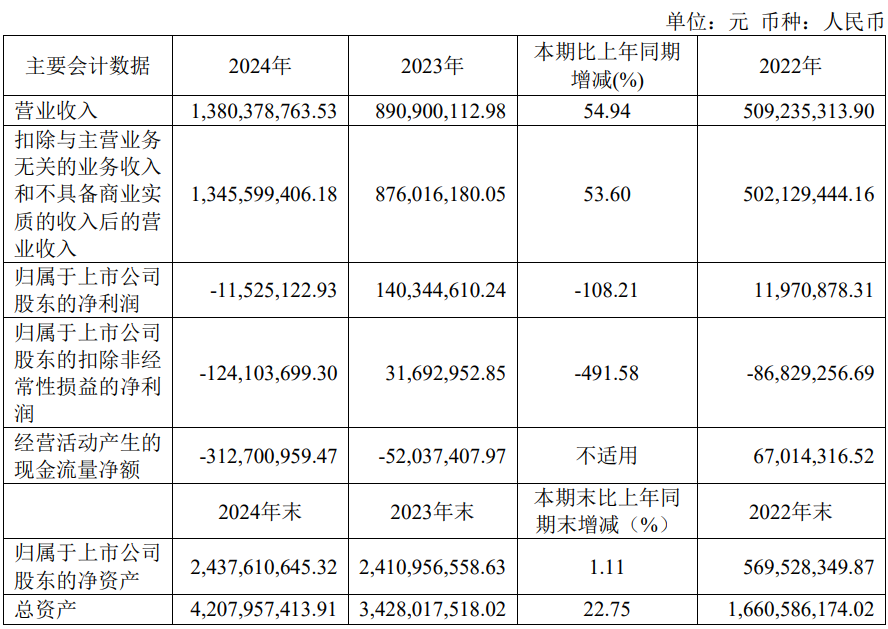 中国经济网北京4月7日讯 中科飞测(688361.SH)近日披露2024年年度报告,公司去年实现营业收入13.80亿元,同比增长54.94%;归属于上市公司股东的净利润-1152.51万元,上年同期为1.40亿元;归属于上市公司股东的扣非净利润-1.24亿元,上年同期为-3169.30万元;经营活动产生的现金流量净额为-3.13亿元,上年同期为-5203.74万元
