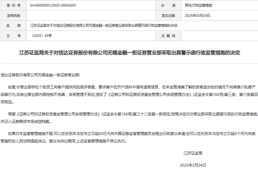 根据《证券公司和证券投资基金管理公司合规管理办法》(证监会令第166号)第三十二条第一款规定,江苏证监局决定对信达证券股份有限公司无锡金融一街证券营业部采取出具警示函的行政监管措施,并记入证券期货市场诚信档案。