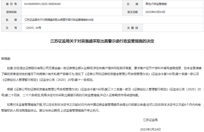 江苏证监局网站同日披露的的关于对吴强盛采取出具警示函行政监管措施的决定显示,经查,吴强盛在信达证券股份有限公司无锡金融一街证券营业部从业期间,存在向客户提供风险测评答案、要求客户在开户资料中填写虚假信息、在未全面准确了解投资者适当性的情况下向其推介有关私募产品等行为,违反了《证券公司和证券投资基金管理公司合规管理办法》(证监会令第166号)第十条第一款以及《证券经纪人管理暂行规定》(证监会公告〔2020〕20号)第十一条规定。