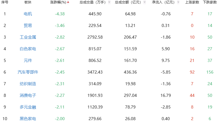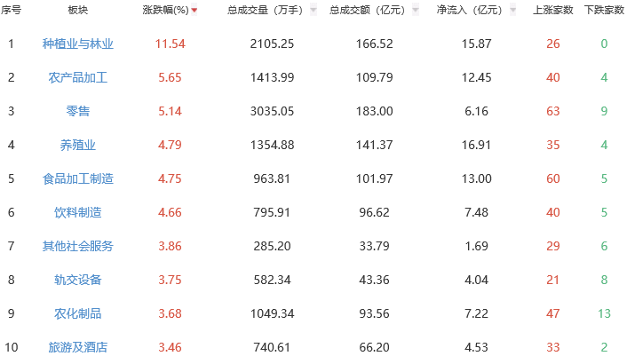 板块方面,种植业与林业、农产品加工、零售等板块涨幅居前,电机、贸易、工业金属等板块跌幅居前。