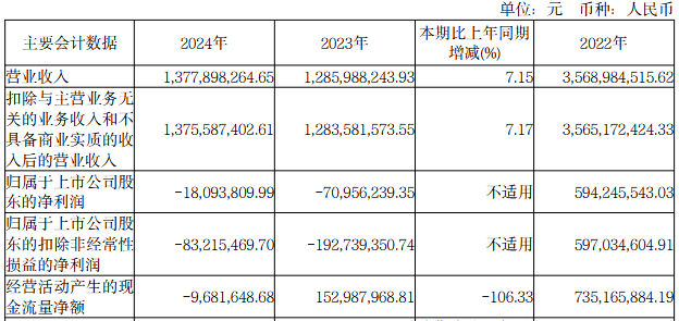 2024年,公司实现营业收入13.78亿元,同比增长7.15%;归属于上市公司股东的净利润为-1,809.38万元,上年同期为-7,095.62万元;归属于上市公司股东的扣除非经常性损益的净利润为-8,321.55万元,上年同期为-19,273.94万元;经营活动产生的现金流量净额为-968.16万元,上年同期为15,298.80万元。