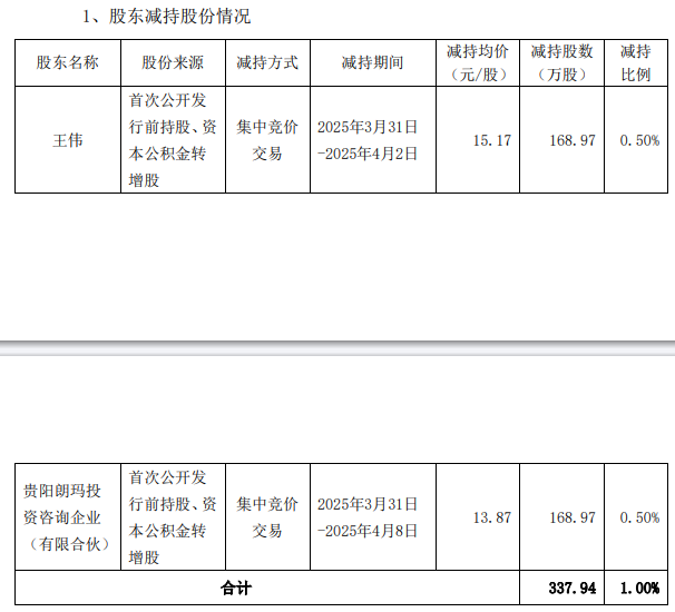 控股股东、实际控制人王伟及其一致行动人朗玛投资咨询合计减持337.94万股,减持比例为1%。经中国经济网记者计算,依照减持均价,控股股东、实际控制人王伟及其一致行动人朗玛投资咨询合计减持金额约为4906.89万元。