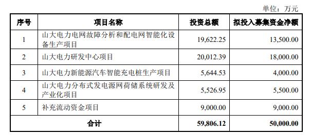 山大电力拟在深交所创业板发行股票总数不超过4,072.00万股,占发行后总股本的比例不低于25.00%。山大电力拟募集资金5亿元,用于山大电力电网故障分析和配电网智能化设备生产项目、山大电力研发中心项目、山大电力新能源汽车智能充电桩生产项目、山大电力分布式发电源网荷储系统研发及产业化项目、补充流动资金项目。