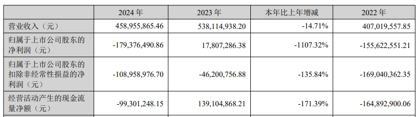 中国经济网北京4月11日讯 豪尔赛(002963.SZ)昨晚披露的2024年年度报告显示,2024年,公司实现营业收入4.59亿元,同比下降14.71%;归属于上市公司股东的净利润-1.79亿元,上年同期1780.73万元;归属于上市公司股东的扣除非经常性损益的净利润-1.09亿元,上年同期-4620.08万元;经营活动产生的现金流量净额为-9930.12万元,上年同期为1.39亿元。