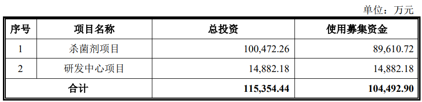 泰禾股份本次发行募集资金总额为46,215.00万元,扣除发行费用后的实际募集资金净额为38,977.28万元。泰禾股份4月7日披露的招股书显示,公司原拟募集资金104,492.90万元,用于杀菌剂项目、研发中心项目。