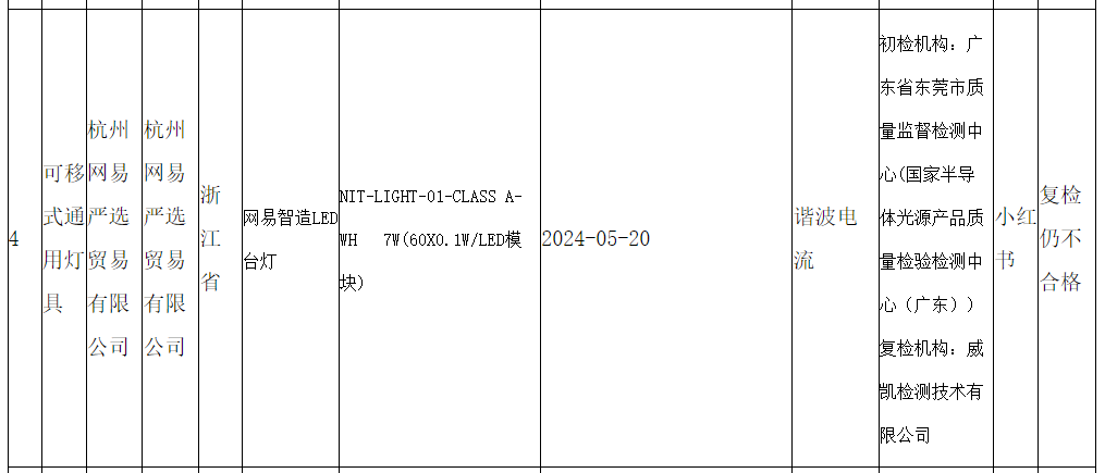 标称生产单位为杭州网易严选贸易有限公司的网易智造LED台灯主要不合格项目为谐波电流,规格型号为MSP-B2 15W 72×0.2W/LED,生产日期为2024年5月20日。