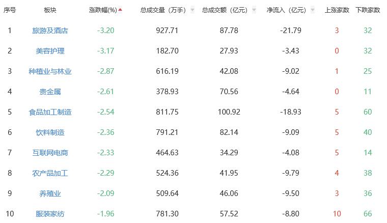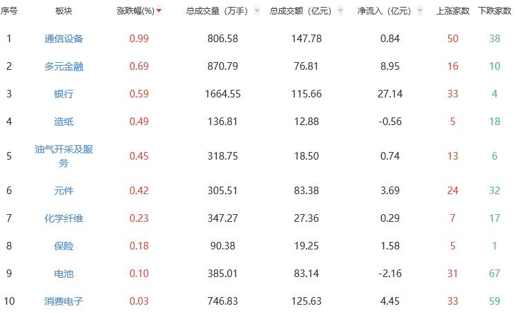 板块方面,通信设备、多元金融、银行等涨幅居前,旅游及酒店、美容护理、种植业与林业等跌幅居前。