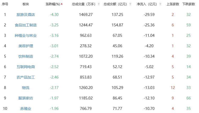 板块方面,通信设备、房地产、元件等涨幅居前,旅游及酒店、食品加工制造、种植业与林业等跌幅居前。