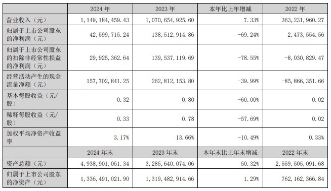 中国经济网北京4月18日讯 惠城环保(300779.SZ)昨日晚间披露2024年年度报告。2024年公司实现营业收入11.49亿元,同比增长7.33%;归属于上市公司股东的净利润4259.97万元,同比下降69.24%;归属于上市公司股东的扣除非经常性损益的净利润2992.54万元,同比下降78.55%;经营活动产生的现金流量净额1.58亿元,同比下降39.99%。