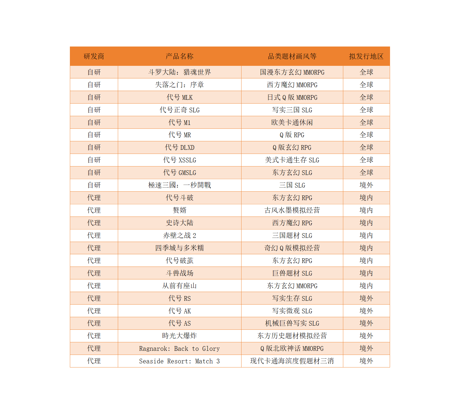除了上述两款新游,年报显示,现阶段三七互娱储备的游戏超过20款,涵盖西方魔幻、东方玄幻、三国、现代、古风等题材在内的多款精品,其中包括东方玄幻MMORPG《斗罗大陆:猎魂世界》、日式Q版MMORPG《代号MLK》、写实三国SLG《代号正奇SLG》、美式卡通生存SLG《代号XSSLG》、东方玄幻SLG《代号GMSLG》、古风水墨模拟经营《赘婿》、东方玄幻RPG《代号斗破》、东方玄幻RPG《代号破茧》等。