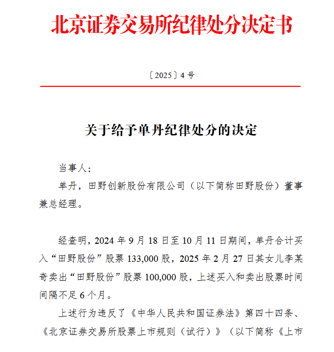 4月18日,北交所发布纪律处分决定书,田野股份(832023)的董事兼总经理单丹因短线交易行为受到纪律处分。调查发现,单丹在2024年9月18日至10月11日期间,合计买入“田野股份”股票13万股,而其女儿李某奇在2025年2月27日卖出“田野股份”股票10万股,且两者之间的交易时间间隔不足6个月。