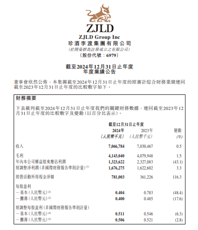 近日,珍酒李渡集团有限公司(以下简称“珍酒李渡”)2024年度业绩公告显示,该公司全年实现营业收入70.67亿元,同比增长0.5%;经调整净利润16.76亿元,同比增长3.3%。不过,海报新闻记者注意到,其旗舰品牌珍酒收入有所下滑。